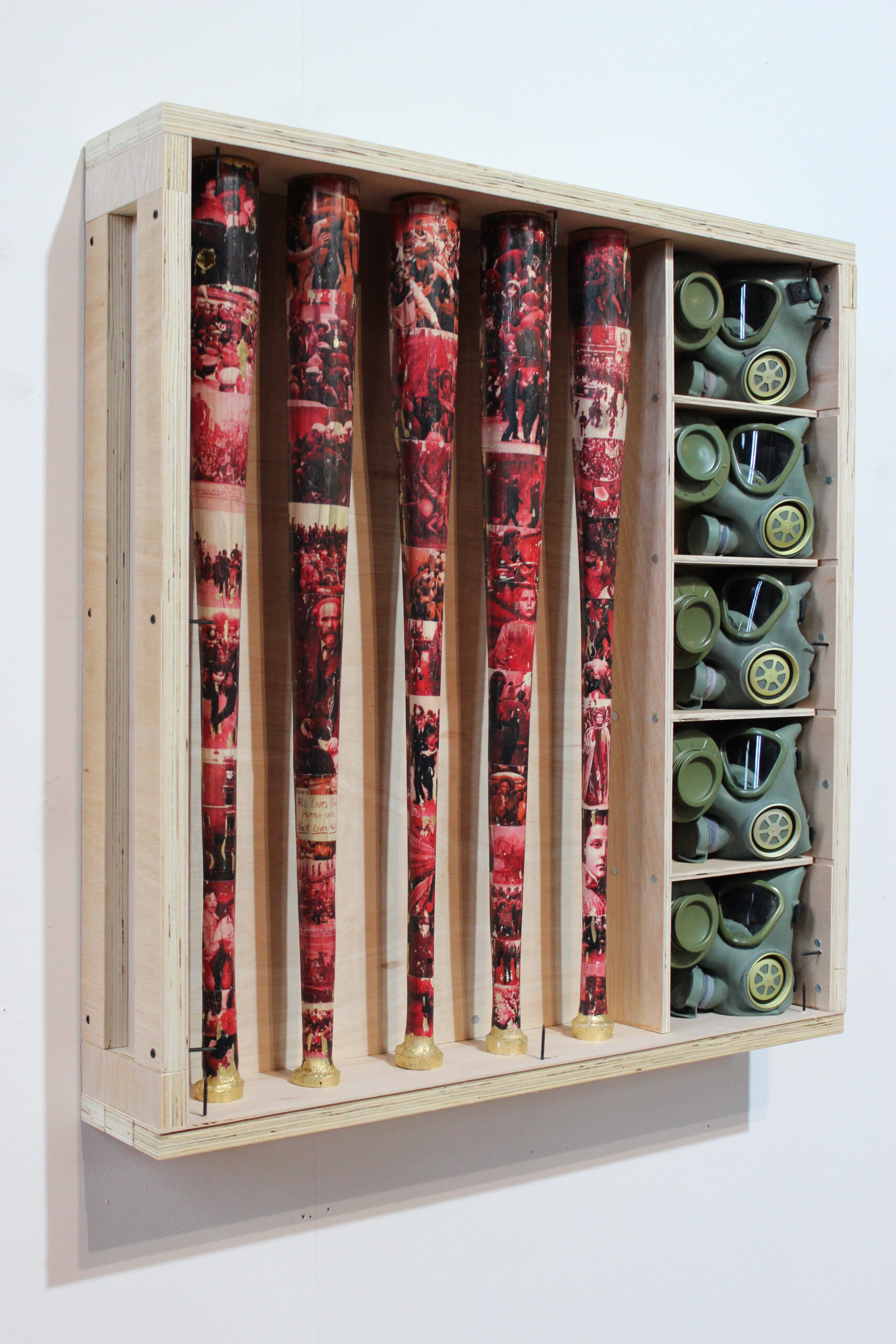 Gas Gas Gas (2022) Soviet era gas masks, with hand carved not ruined b baseball bats made from recycled studio walls. Presented in their own crate and decorated with images from British social history.